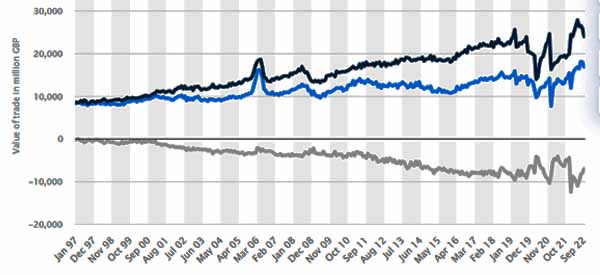 In 2020, more than 80% of all UK trade volume was with European countries like Germany and France. The chart below shows the trade flow between the two places in years.
