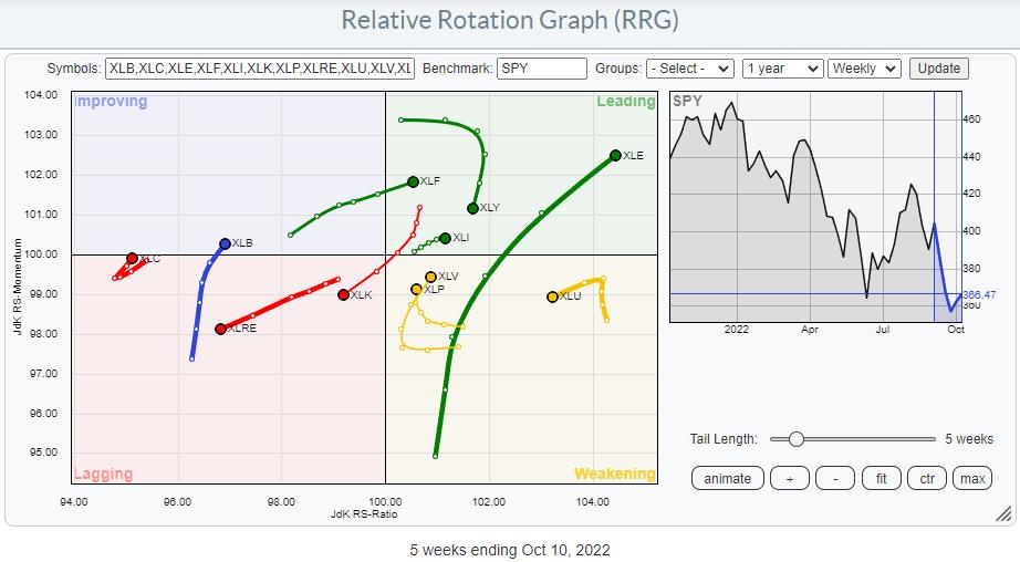 It's interesting to see how mixed that group is. Starting from the right, XLE is the strongest sector, followed by XLI. Both are sensitive sectors. The big difference is the length of the trail on both. Energy obviously has a lot of power behind the move, as it shows the longest tail in the plot. XLI is the opposite, with the shortest tail and a lot less relative momentum.