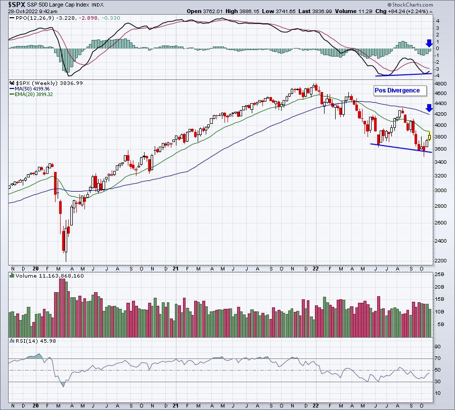 When I see positive divergences form, I immediately consider the higher probability of a 50-period SMA test and/or a PPO centerline test (blue arrows). That's worth watching throughout Q4.